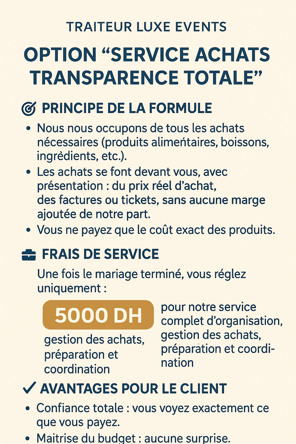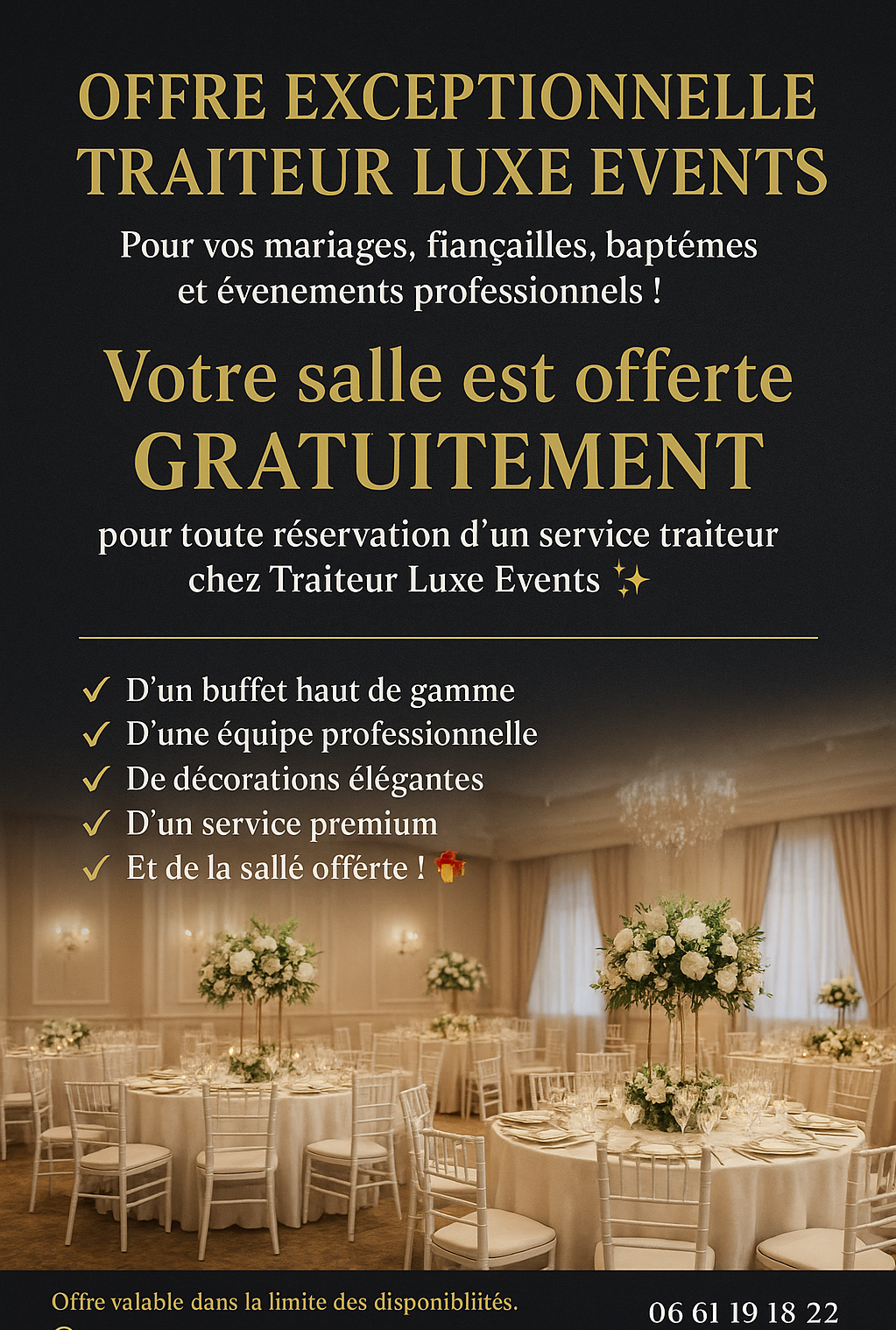 Chez Traiteur Luxe Events, nous transformons chaque événement en une expérience inoubliable. Spécialisés dans l’organisation d’événements sur mesure au Maroc, nous accompagnons particuliers et entreprises dans la réalisation de mariages de rêve, soirées d’exception, séminaires professionnels et réceptions élégantes.